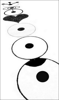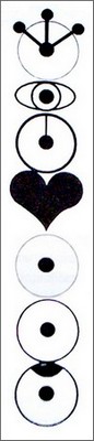 Un long pictogramme, c'est ainsi qu'est présenté cet ensemble de cercles. Au premier coup d'œil on repère la symbolique des chakras. Les sept points sont alignés selon un axe rectiligne. Le quatrième symbole est un cœur, le sixième est un oeil et le septième, une couronne.