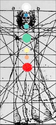 Les sept centres énergétiques sont alignés le long de la colonne vertébrale depuis la région du sacrum jusqu'au sommet de la tête que l'on appelle chakra coronal. Dans les cercles de blé, on retrouve bien le coronal sous la forme symbolique d'une couronne dirigée vers " Pewsey White Horse. "