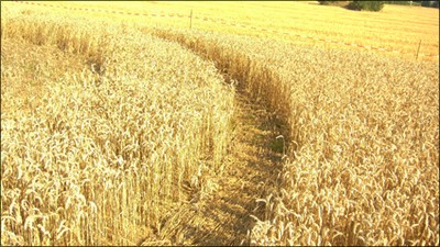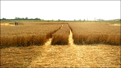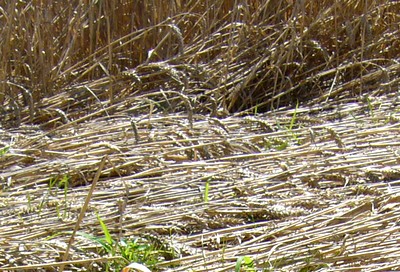 Quelques indices qu’on ne pouvait pas voir tout de suite. Les tiges de blé qui sont à la périphérie des cercles sont prises dans les « mailles » des celles qui sont restées droites. On s’aperçoit alors qu’elles ne sont pas écrasées comme les autres, elles sont à l’image de ce qui a dû être dans tout le crop circle au moment de sa formation. Les tiges n’étaient donc pas écrasées mais versées comme le disent les premiers visiteurs. (voir photo)