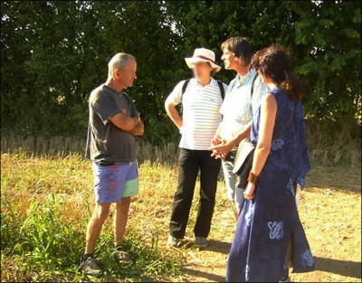 L’équipe au travail à Valence dans le site du CC : Discussion très enrichissante avec M. Roger G. le propriétaire du champ, une des premières personnes a avoir foulé le crop circle, le jour de sa découverte. Le physicien géobiologue E.S, le chercheur / écrivain Umberto Molinaro, la médium A.T. qui travaille sur les Crop circles depuis de nombreuses années.