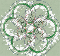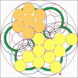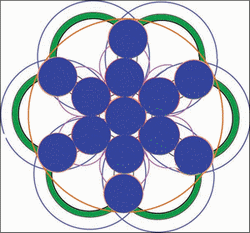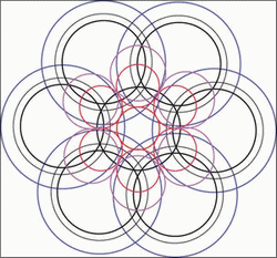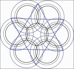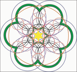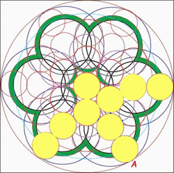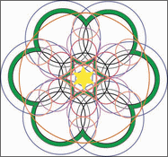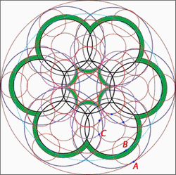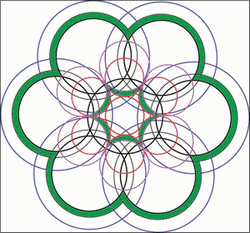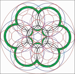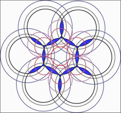 Le coeur de cette fleur de vie est composé de six croissants de lune, si vous tracez le cercle inscrit dans cette figure vous avez l'élément générateur de l'ensemble.