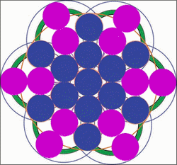 Quelle merveille ! Ce crop circle met en valeur les cinq cercles (en bleu) que l'on trouve dans la géométrie sacrée très utilisée au moyen âge, mais en plus, c'est la couronne qui nous donne un élèment très intéressant. Nous trouvons une autre série de cercles identiques ( violet). Rien n'est dû au hasard, on reconnaît la signature des vrais crop circles.